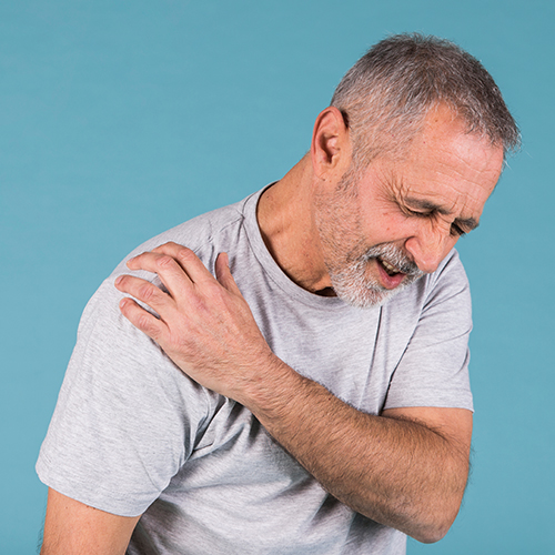 Stiffness and pain in the shoulder joint that limits movement over time.
